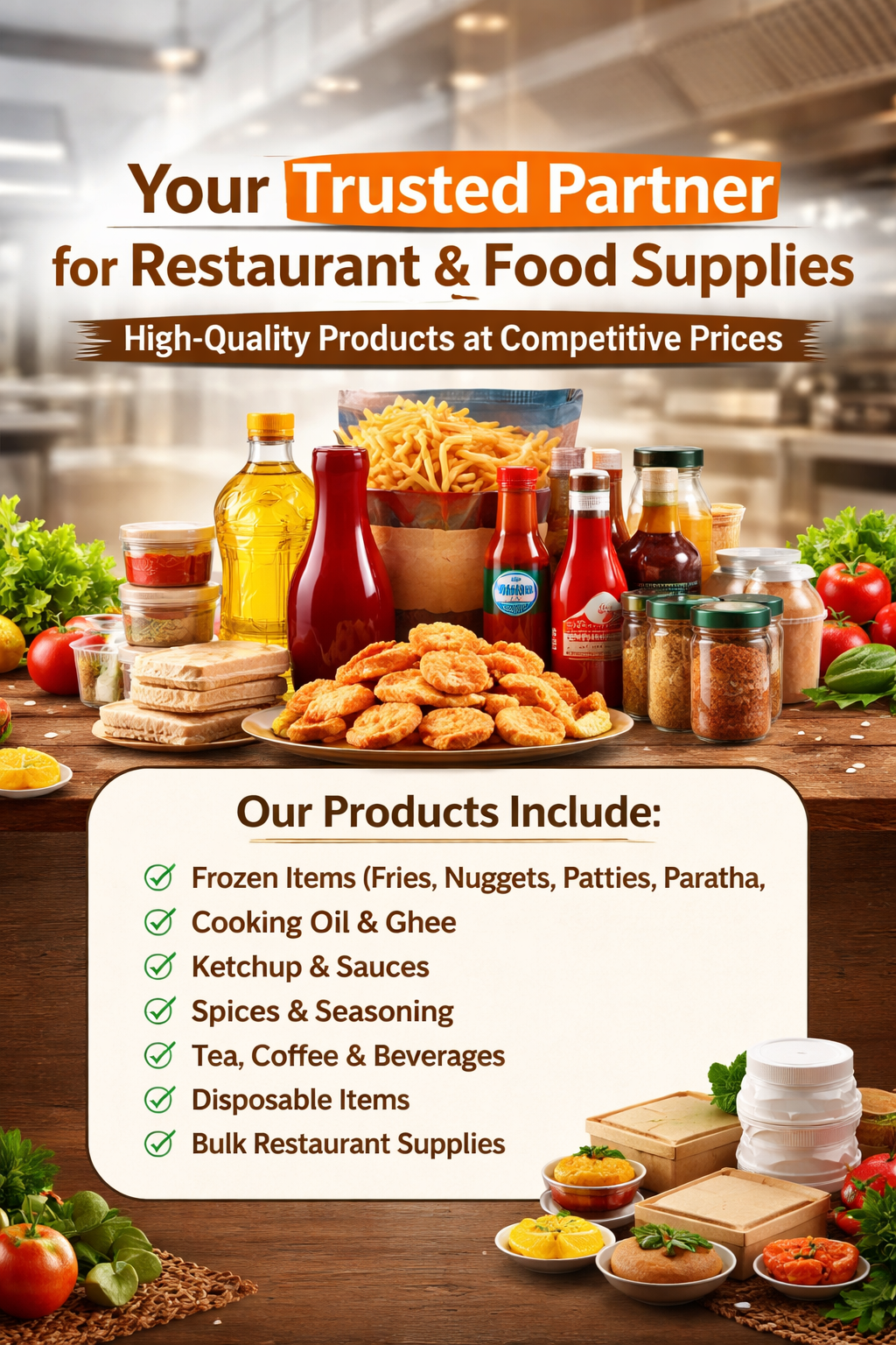 We provide high-quality frozen food, cooking oil, sauces, ketchup, spices, and all kitchen-related items at competitive prices.